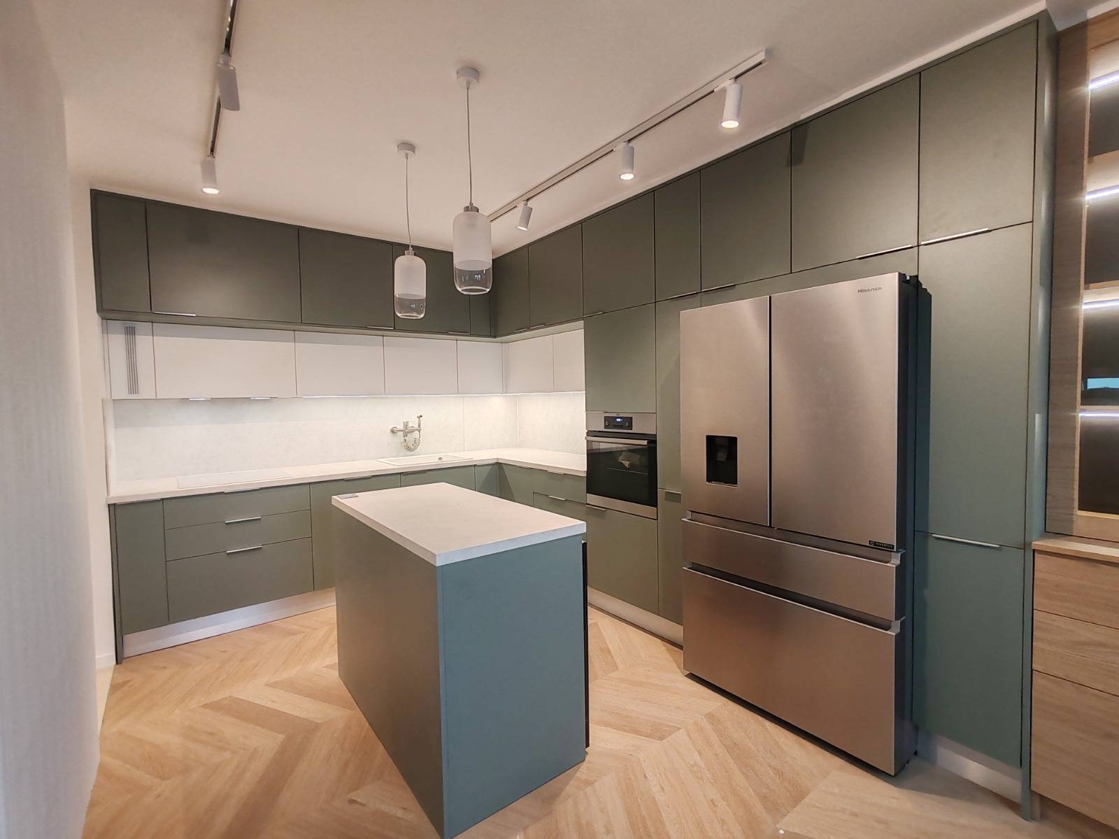 Zeleni tonovi unose mir i prirodnu toplinu, dok svijetli pod i siva radna ploča stvaraju osjećaj prozračnosti i reda.